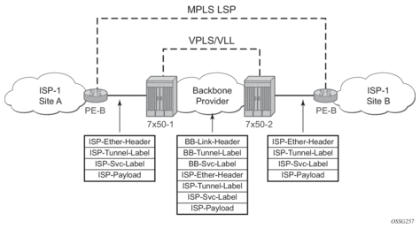 The operational theory of a service tunnel is that the encapsulation of the data between the two Nokia service routers (such as the 7950 XRS, 7750 SR, 7750 SR MG, and 7450 ESS) appears like a Layer 2 path to the service data although it is really traversing an IP or IP/MPLS core. The tunnel from one edge device to the other edge device is provisioned with an encapsulation and the services are mapped to the tunnel that most appropriately supports the service needs.