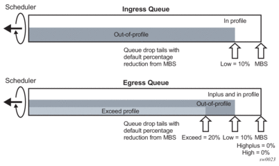 At ingress there is a low drop tail in addition to the MBS. High enqueuing priority packets (for ingress SAP priority mode queues) and in-profile packets (for ingress SAP profile mode queues, network, and shared queues) are allowed to fill up the queue up to the MBS, however, low enqueuing priority packets (for ingress SAP priority mode queues) and out-of-profile packets (for ingress SAP profile mode queues, network, and shared queues) can only fill the queue up to the queue's low drop tail setting.