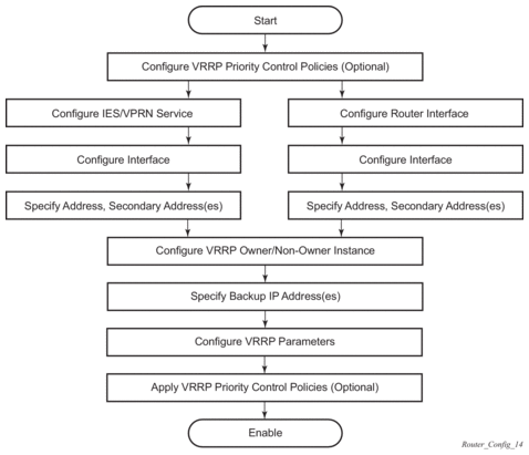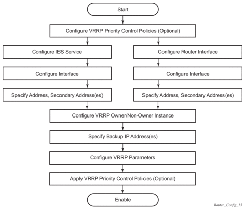The Virtual Router Redundancy Protocol (VRRP) for IPv4 is defined in the IETF RFC 3768, Virtual Router Redundancy Protocol. VRRP for IPv6 is specified in draft-ietf-vrrp-unified-spec-02.txt and only applies to the 7750 SR and 7950 XRS. VRRP describes a method of implementing a redundant IP interface shared between two or more routers on a common LAN segment, allowing a group of routers to function as one virtual router. When this IP interface is specified as a default gateway on hosts directly attached to this LAN, the routers sharing the IP interface prevent a single point of failure by limiting access to this gateway address. VRRP can be implemented on IES service interfaces and on core network IP interfaces.