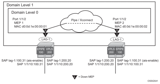 A similar condition exists if down MEPs are configured on the SAPs that are operationally down. Figure 44 shows how the same service configured with down MEPs would generate AIS, if enabled, toward the remote client at the configured client-meg-level, in the reverse direction of the MEP. This is also the proper behavior from the perspective ETH-CFM.