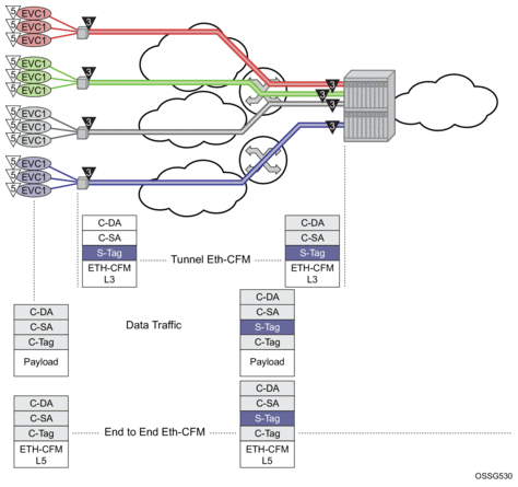 As described in the 7450 ESS, 7750 SR, 7950 XRS, and VSR OAM and Diagnostics Guide, MEPs can be implemented at the service or the facility level. The focus of this guide is on how the ETH-CFM MPs are configured within the service hierarchy level. However, because of the wide range of features that the ITU-T has defined in recommendation Y.1731 (Fault Management, Performance Management and Protection Mechanisms) the features may be applied to other features and hierarchies. For example, Ethernet Ring Protection (G.8032) also make use of various ETH-CFM functions. Different section in this guide may contain ETH-CFM specific material as it applies to that specific feature.