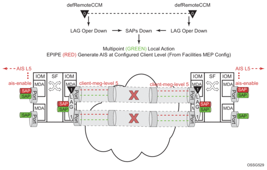 A facility MEP may trigger two distinct actions as a result of fault. Epipe services generate AIS that have been configured to do so as a result of a failure. The level of the AIS is derived from the facility MEP. Multiple client-meg-levels can be configured under the facility MEP to allow for operational efficiency in the event a change is required. However, only the lowest AIS level is generated for all the linked and applicable services. VPLS, IES and VPRN SAPs transition the SAP state that are configured to react to the facility MEP state. In addition, Epipe services may also take advantages of OAM and mapping functions.