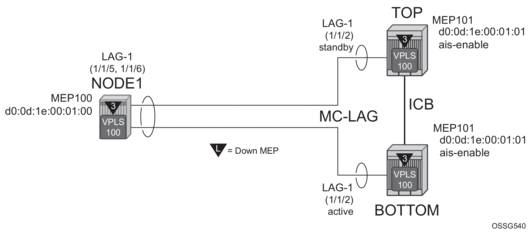 Only one of the MEPs on the MC-LAG nodes is active for VPLS service 100. The other MEP is in a shutdown mode, so that even when the MC-LAG is in standby and the port state is Link Up, the MEP is in a pseudo shutdown state.