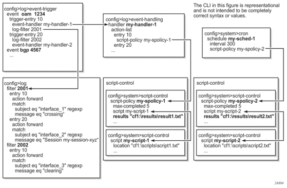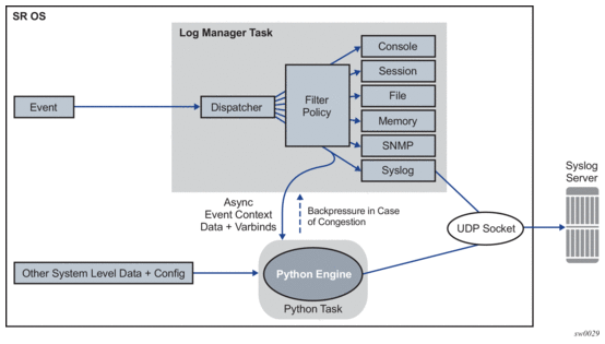 An event log within the OS associates the event sources with logging destinations. Examples of logging destinations include, the console session, a specific telnet or SSH session, memory logs, file destinations, SNMP trap groups and syslog destinations. A log filter policy can be associated with the event log to control which events will be logged in the event log based on combinations of application, severity, event ID range, router name (vrtr-name), and the subject of the event.