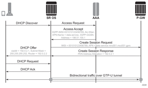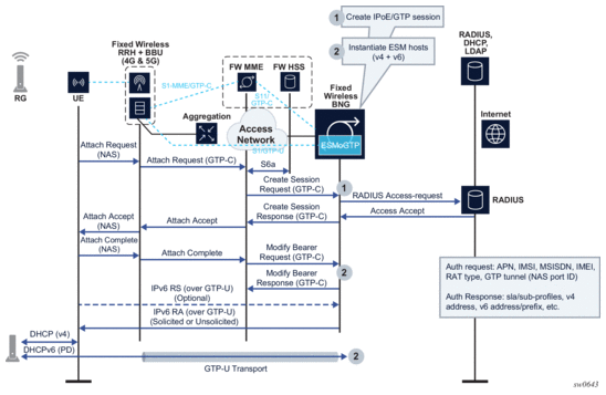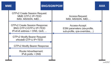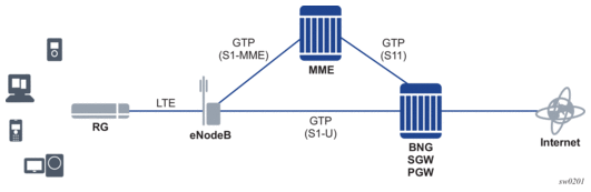 SR OS supports TPSDA functionality over GTP access funnels towards eNodeBs using the S11 (GTPv2-C) and S1-U (GTP-U) interfaces toward MME and eNodeB. In this setup, the SR OS router performs the roles of BNG, SGW, and PGW. Both IPv4 and IPv6 connectivity over GTP is supported. GTP session authentication can be performed using LUDB, RADIUS, or NASREQ. GTP access termination is built on top of forwarding path extensions.