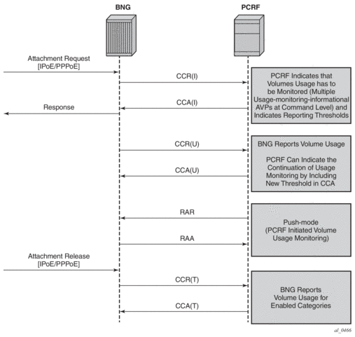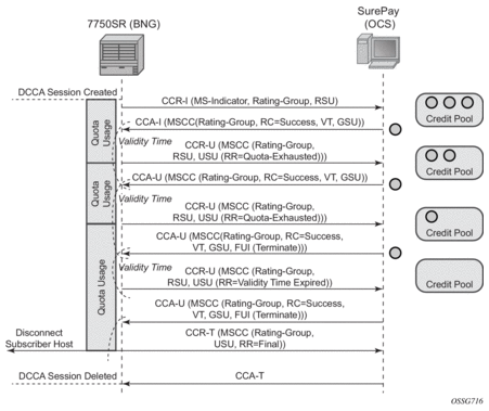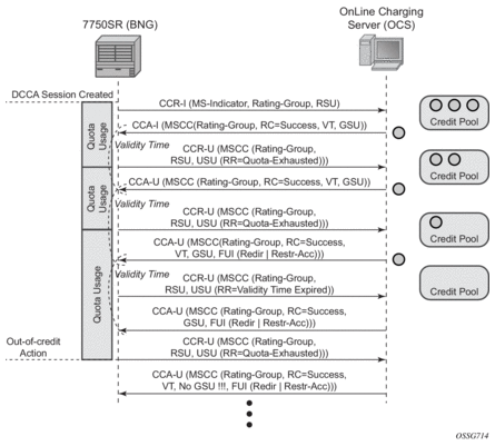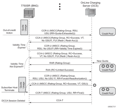 The 3GPP-based Diameter Credit Control Online charging applications allow the control of subscriber access to services based on a pre-paid credit. The volume and time accounting on the node supports online charging using the Diameter Credit-Control Application (DCCA). The node supports Session Charging with Unit Reservation (SCUR), allowing the node to reserve volume and time quotas for rating-groups. Furthermore, the node supports centralized unit determination and centralized rating: it requests quotas and reports usage against the quota provided by the Online Charging Server (OCS). Credit control is always on a per-rating group basis. A rating group maps to a category inside a category map of the node volume-based and time-based accounting function.