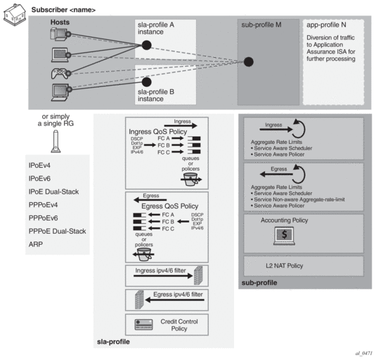 Subscriber Host Policy – A collection of PCC rules (classifiers and actions), Gx overrides, NAS filter inserts and statically configured rules (CLI defined QoS or filter) that are together applied to the subscriber host.