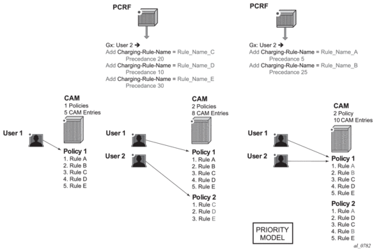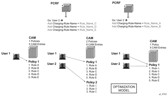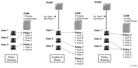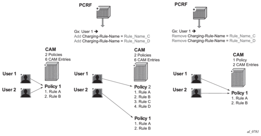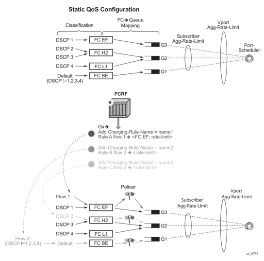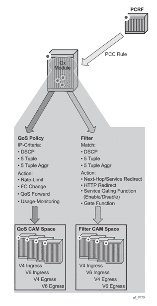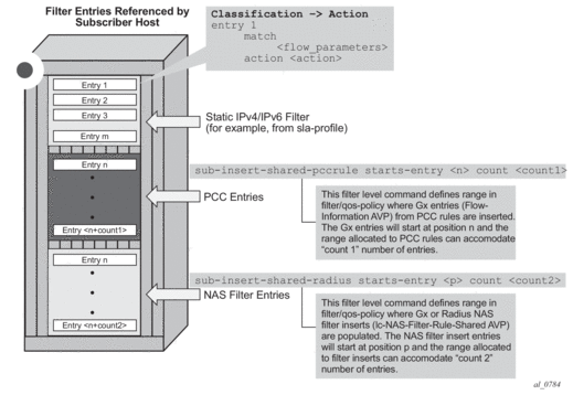 Gx flows are similar to dynamically created filter or ip-criteria (QoS) entries and are inserted within the entry range configured for the base filter/qos-policy.