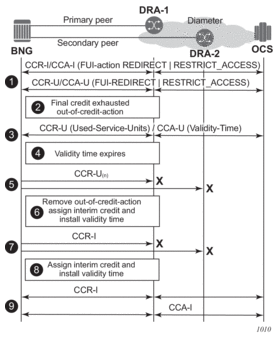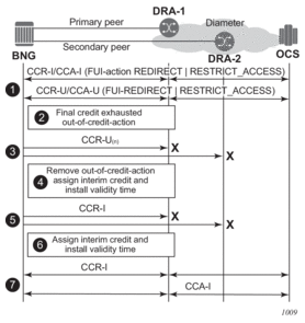 When the quota is depleted, the subscriber is redirected to a web portal. When the credit is refilled, the OCS server notifies the BNG and provides a new quota. The configured out-of-credit-action when receiving a Final Unit Indication with action different from terminate is installed. See Figure 206 and Figure 207.