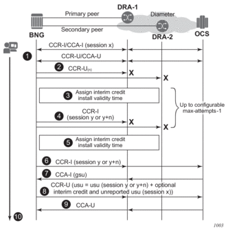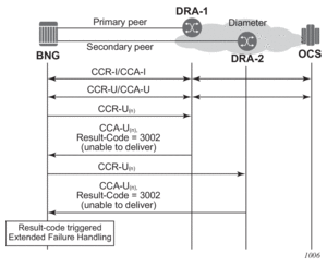 Once the failed peer is restored, forwarding is resumed on the restored peer for all new and existing sessions if this peer is the best next hop for the user session (dictated by peering and realm table). There is no user session stickiness to the peer and instead the routing of the Diameter request messages always follows the routing and forwarding tables. It is important to note that peer failover refers to the Diameter base ability to select a new best peer in the list of available peers, in the case where the current peer becomes unavailable. This rerouting of Diameter application messages is independent of the application level message retransmissions. Once the Diameter base determines that it cannot deliver the request message (for example, CCR times out or the next hop to the destination-realm is unavailable), the Diameter base notifies the application level. The application (NASREQ, Gx, or Gy) then decides (by a configuration option) whether it will re-transmit timed-out request messages (CCR).