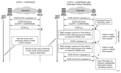In a Diameter Gy application, that is, a Diameter Credit Control Application (DCCA), Credit Control Failure Handling (CCFH) determines the behavior of a credit control client in fault situations. When the CCFH value is set to CONTINUE and a failure occurs, the credit control client first attempts a failover procedure. If failover is not enabled or not supported by both client and server, or the failover is not successful, the client deletes the credit control session and continues the service to the end user without the Diameter Gy session until the user disconnects.
