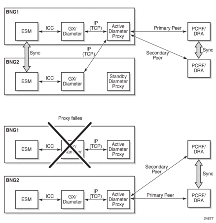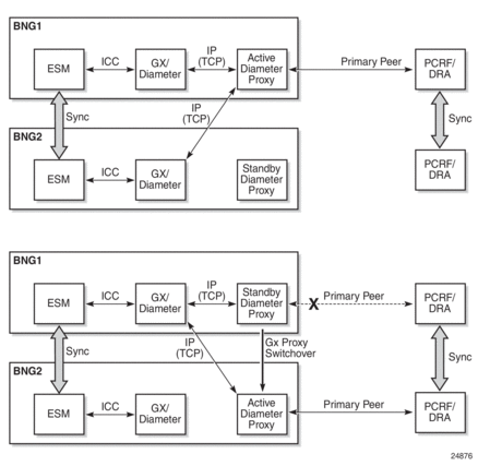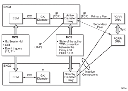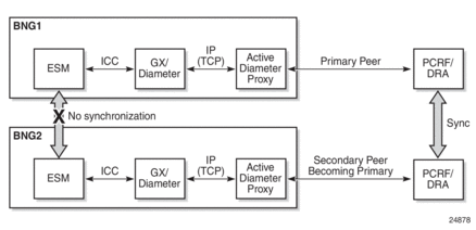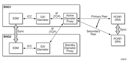 Figure 239 illustrates the basic concept for Diameter Multi-Chassis Redundancy for a Gx application. The model shows two nodes (BNGs). Each BNG contains an ESM module and a Gx/Diameter module which have a peering connection to the active Diameter proxy module. The peering connections are IP connections. Both nodes communicate with the PCRF/DRA through the active Diameter proxy which maintains a peering connection with the PCRF/DRA.