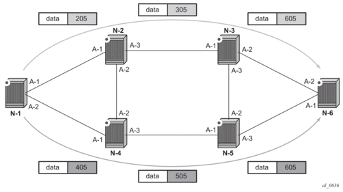 N-1 has an SR tunnel to N-6 with two ECMP paths. It pushes label 205 when forwarding an IP or service packet to N-6 via downstream next-hop N-2 and pushes label 405 when forwarding via downstream next-hop N-4.