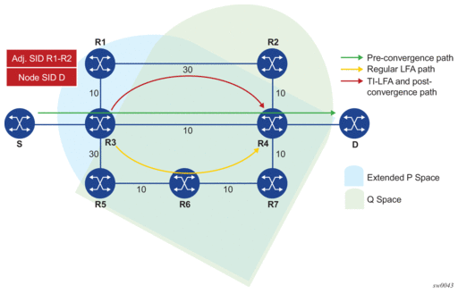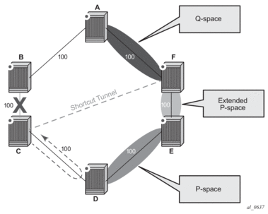 Remote LFA follows a similar algorithm as TI-LFA but does not limit the scope of the calculation of the extended P-Space and of the Q-Space to the post-convergence paths.