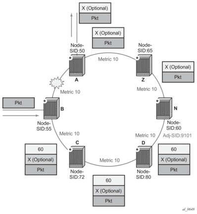 When node N receives the packet while the remote LFA next-hop is activated, it pops the top segment routing label which corresponds to a local node SID. This results in popping this label and forwarding of the packet to the ASBR node over the shortest path (link N-Z).