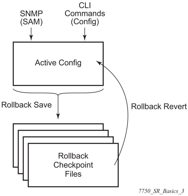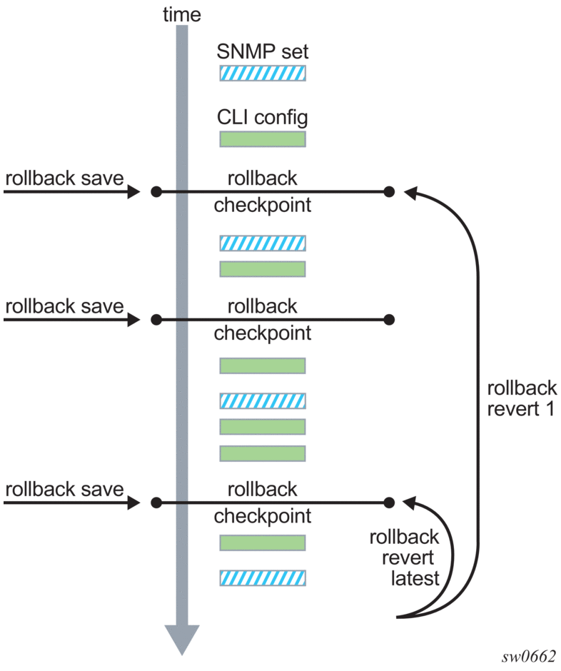 By default, the SR OS automatically creates a new rollback checkpoint after a commit operation. The rollback checkpoint includes the new configuration changes made by the commit. An optional no-checkpoint keyword can be used to prevent the auto-creation of a rollback checkpoint after a commit. If the commit fails, no new rollback checkpoint is created.