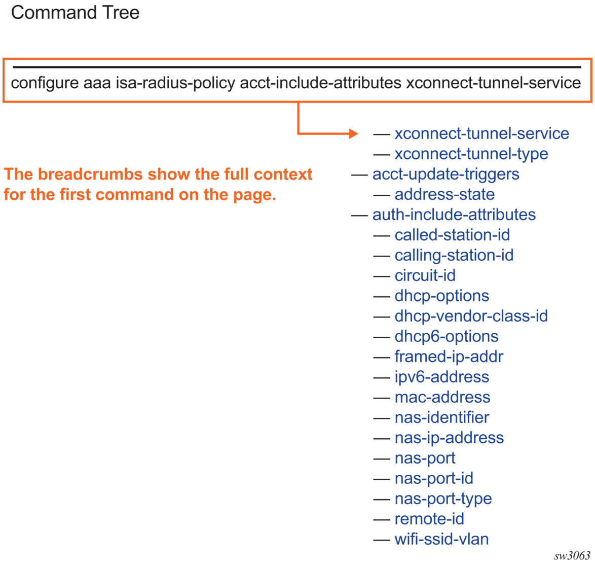 In the CLI tree section, the complete contextual path to the first command on the page is shown at the top of the page, as shown in Figure 2.