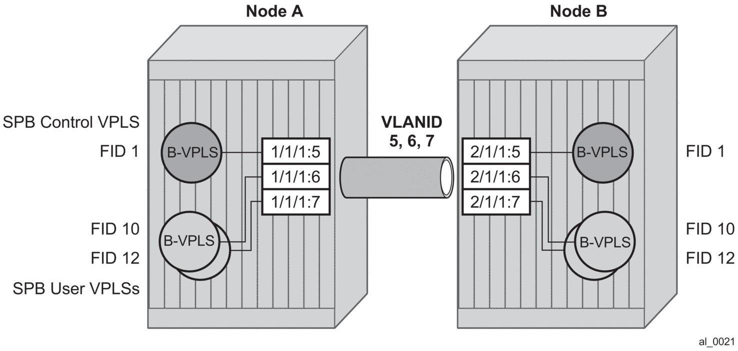 Control B-VPLS are required for the configuration of the SPB parameters and as a service to enable SPB. Control B-VPLS therefore must be configured everywhere SPB forwarding is expected to be active even if there are no terminating services. SPB uses the logical instance and a Forwarding ID (FID) to identify SPB locally on the node. The FID is used in place of the SPB VLAN identifier (Base VID) in IS-IS LSPs enabling a reference to exchange SPB topology and addresses. More specifically, SPB advertises B-MACs and I-SIDs in a B-VLAN context. Since the service model in SR OS separates the VLAN Tag used on the port for encapsulation from the VLAN ID used in SPB the SPB VLAN is a logical concept and is represented by configuring a FID. B-VPLS SAPs use VLAN Tags (SAPs with Ethernet encapsulation) that are independent of the FID value. The encapsulation is local to the link in SR/ESS so the SAP encapsulation has been configured the same between neighboring switches. The FID for a specified instance of SPB between two neighbor switches must be the same. The independence of VID encapsulation is inherent to SR OS PBB B-VPLS. This also allows spoke-SDP bindings to be used between neighboring SPB instances without any VID tags. The one exception is mesh SDPs are not supported but arbitrary mesh topologies are supported by SR OS SPB.
