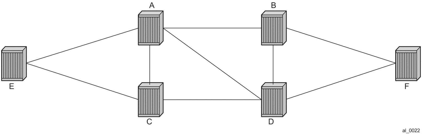 Assume that Node A is the lowest Bridge Identifier and the Multicast root node and all links have equal metrics. Also, assume that Bridge Identifiers are ordered such that Node A has a numerically lower Bridge identifier than Node B, and Node B has lower Bridge Identifier than Node C, and so on, Unicast paths are configured to use shortest path tree (SPT). Figure 113 shows the shortest paths computed from Node A and Node E to Node F. There are only two shortest paths from A to F. A choice of low-path-id algorithm uses Node B as transit node and a path using high-path-id algorithm uses Node D as transit node. The reverse paths from Node F to A are the same (all unicast paths are reverse path congruent). For Node E to Node F there are three paths E-A-B-F, E-A-D-F, and E-C-D-F. The low-path-id algorithm uses path E-A-B-F and the high-path-id algorithm uses E-C-D-F. These paths are also disjoint and are reverse path congruent. Any nodes that are directly connected in this network have only one path between them (not shown for simplicity).