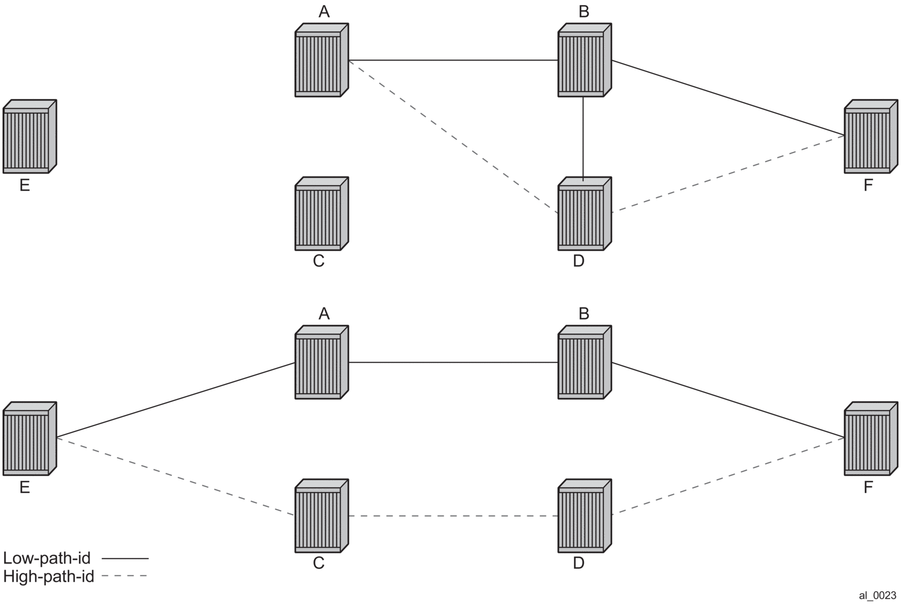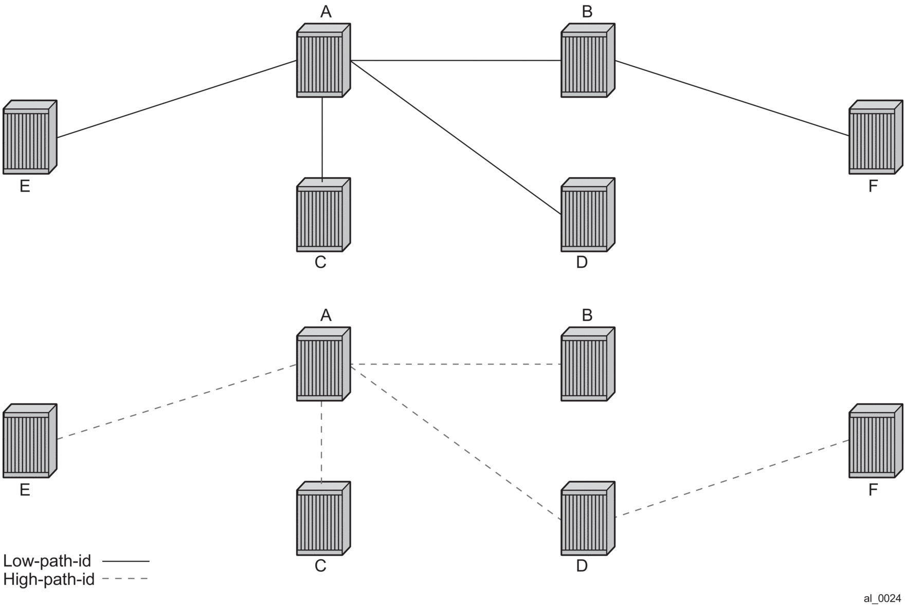 For Multicast paths the algorithms used are the same low-path-id or high-path-id but the tree is always a single tree using the root selected as described earlier (in this case Node A). Figure 114 shows the multicast paths for low-path-id and high-path-id algorithm.