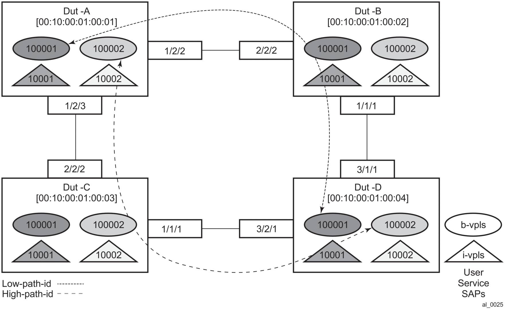 A user B-VPLS service 100002 is configured and it uses B-VPLS 10001 to provide forwarding. It fate shares the control topology. In Figure 118, the control B-VPLS uses the low-path-id algorithm and the user B-VPLS uses high-path-id algorithm. Any B-VPLS can use any algorithm. The difference is illustrated in the path between Dut A and Dut D. The short dashed line through Dut-B is the low-path-id algorithm and the long dashed line thought Dut C is the high-path-id algorithm.