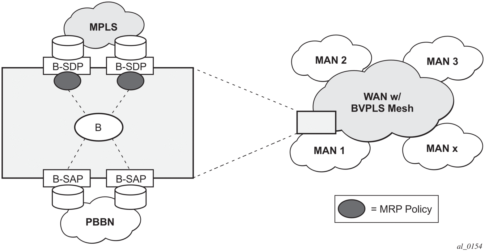 When an Ethernet switching backbone is used for aggregation between PBB PEs, a SAP is used as the B-VPLS up link instead of an SDP. No T-LDP signaling is available.