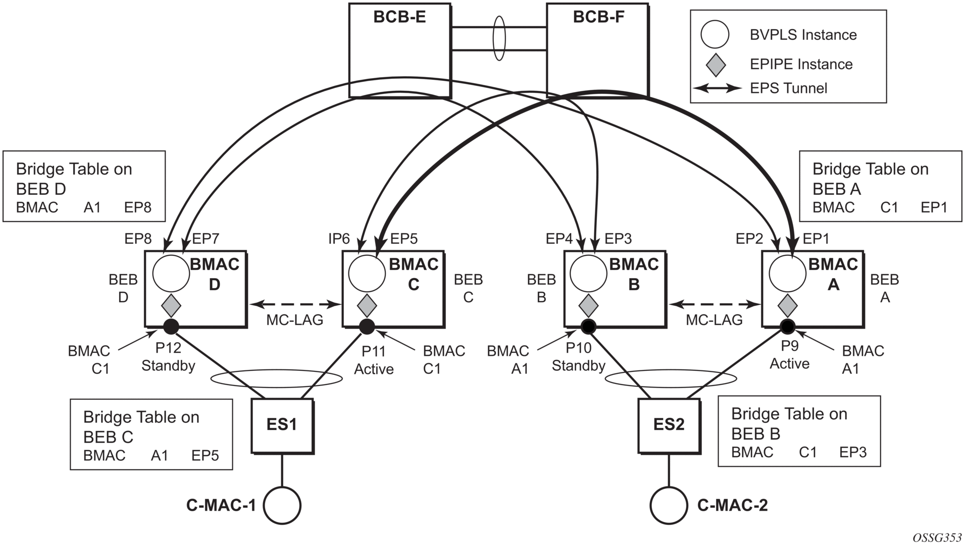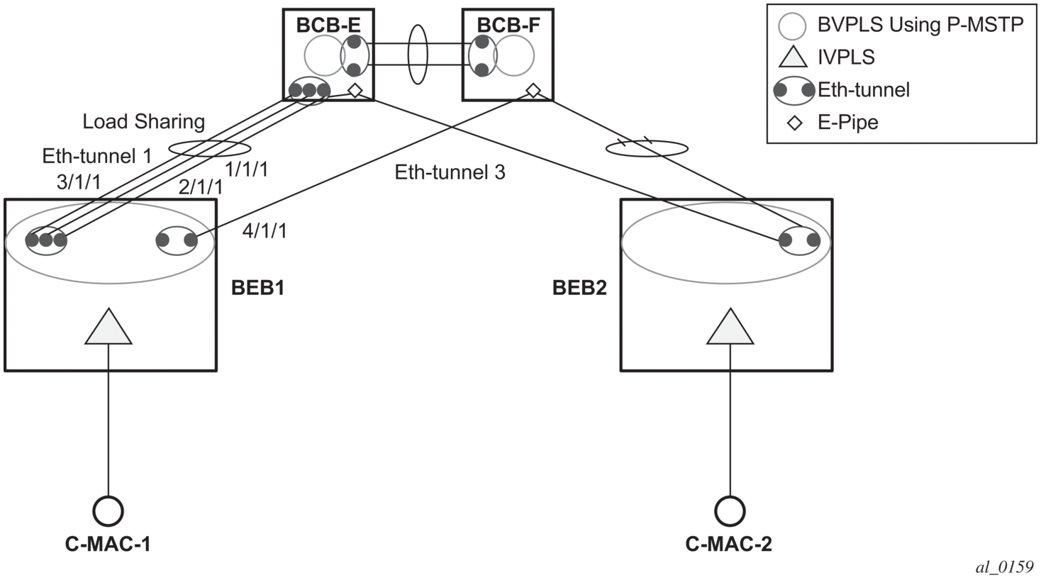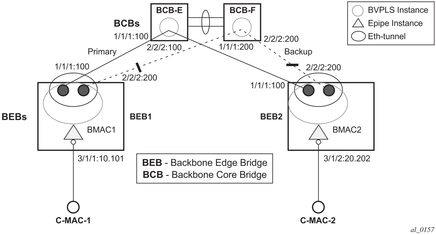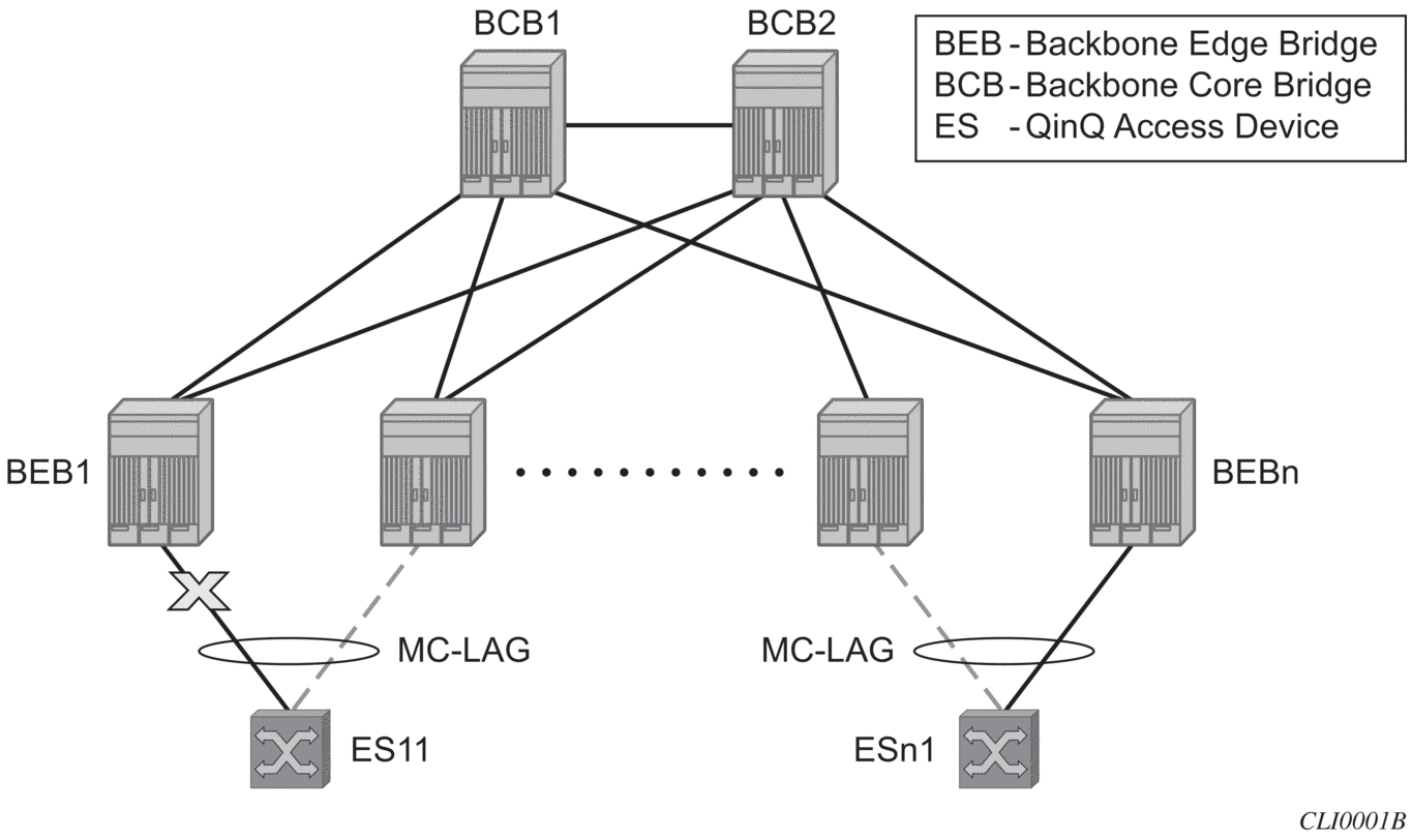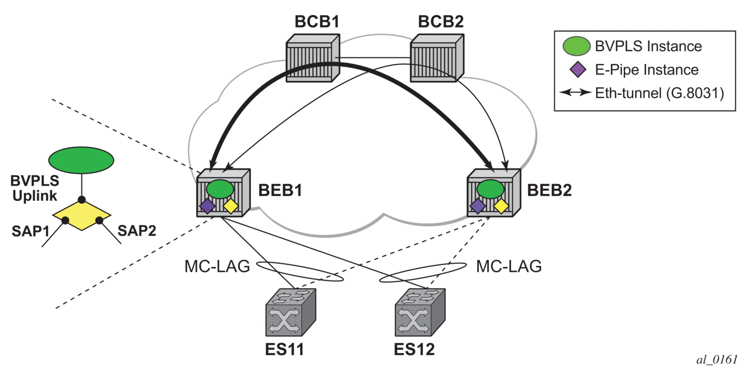 BEB1 to BCB1 L1: 1/1/1 – Member port of LAG-emulation ET1, terminate ET3 |