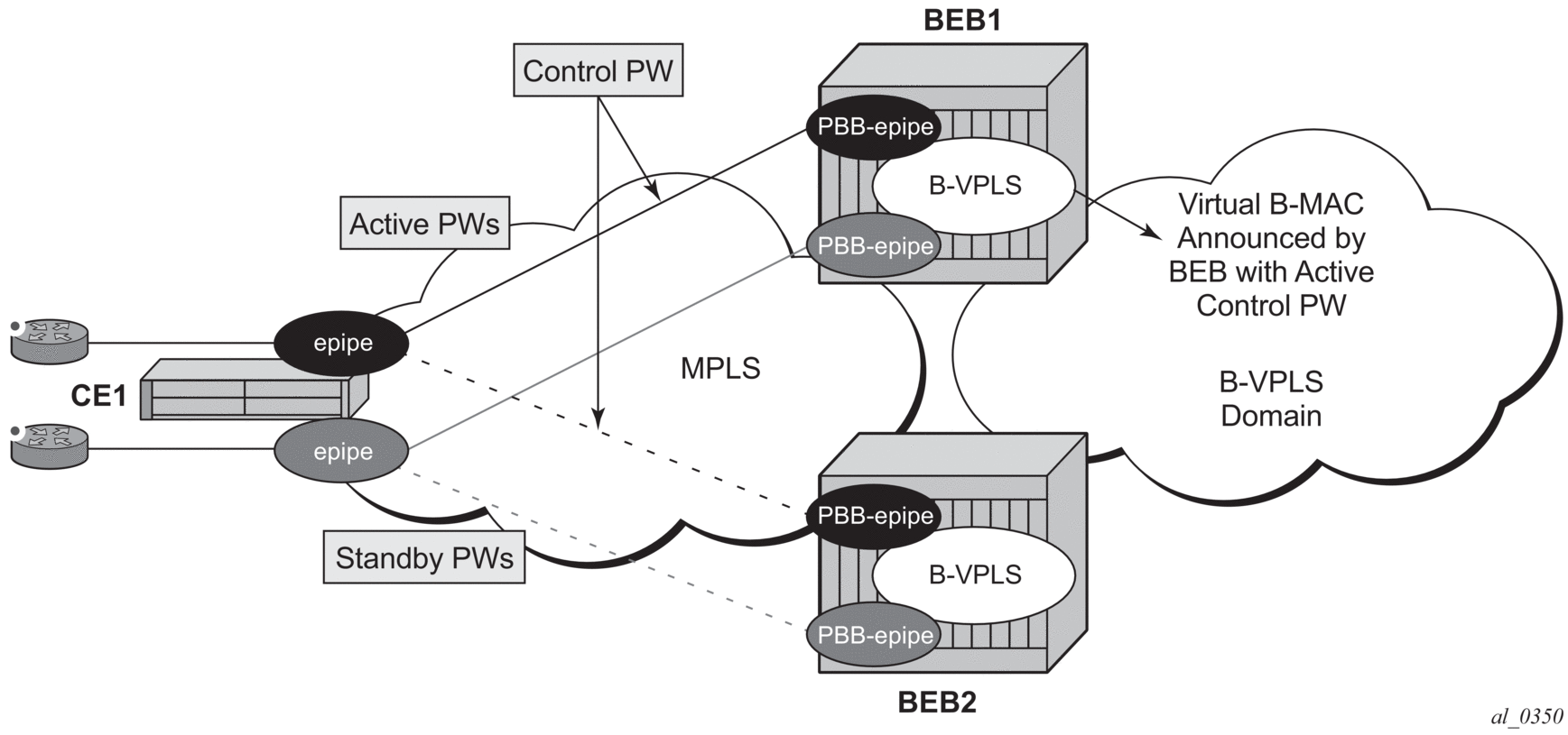 In this topology, the edge device (CE1) is configured with multiple Epipes to provide virtual lease line (VLL) connectivity across a PBB network. CE1 uses active/standby pseudowires (PWs) which terminate in PBB Epipe services on BEB1 and BEB2 and are signaled accordingly using the appropriate pseudowire status bits.