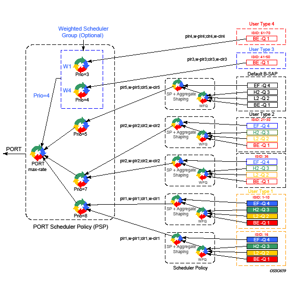 The user type in Figure 136 maps to a specific encap-group defined for the B-SAP in CLI. The operator has the flexibility of scheduling many user types by assigning different scheduling parameters as follows: