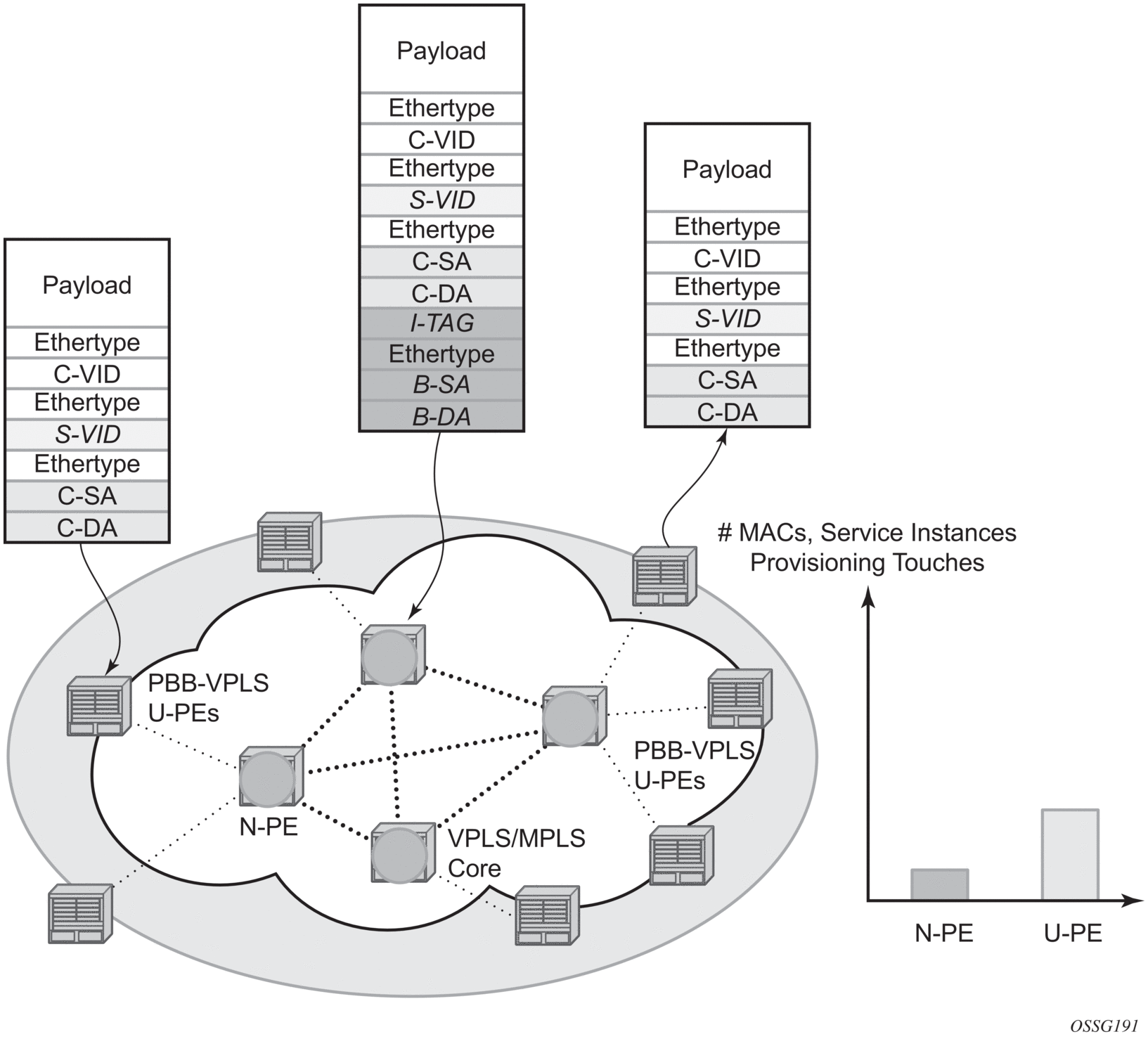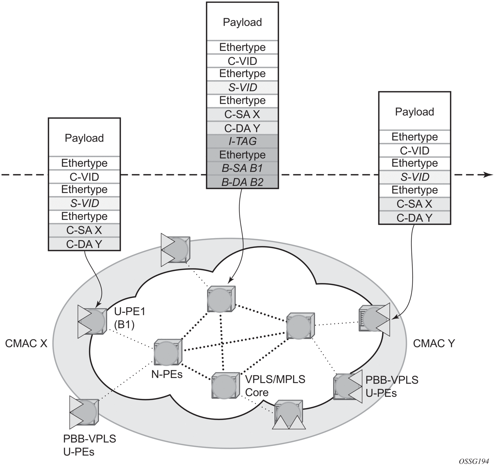 PBB adds a regular Ethernet header where the B-DA and B-SA are the backbone destination and respectively, source MACs of the edge U-PEs. The backbone MACs (B-MACs) are used by the core N-PE devices to switch the frame through the backbone.