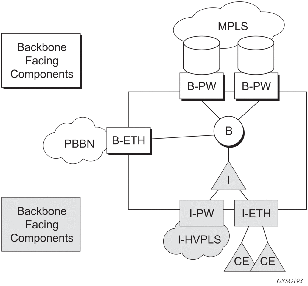 A VPLS context is used to provide the backbone switching component. The white circle marked B, referred to as backbone-VPLS (B-VPLS), operates on backbone MAC addresses providing a core multipoint infrastructure that may be used for one or multiple customer VPNs. The Nokia B-VPLS implementation allows the use of both native PBB and MPLS infrastructures.