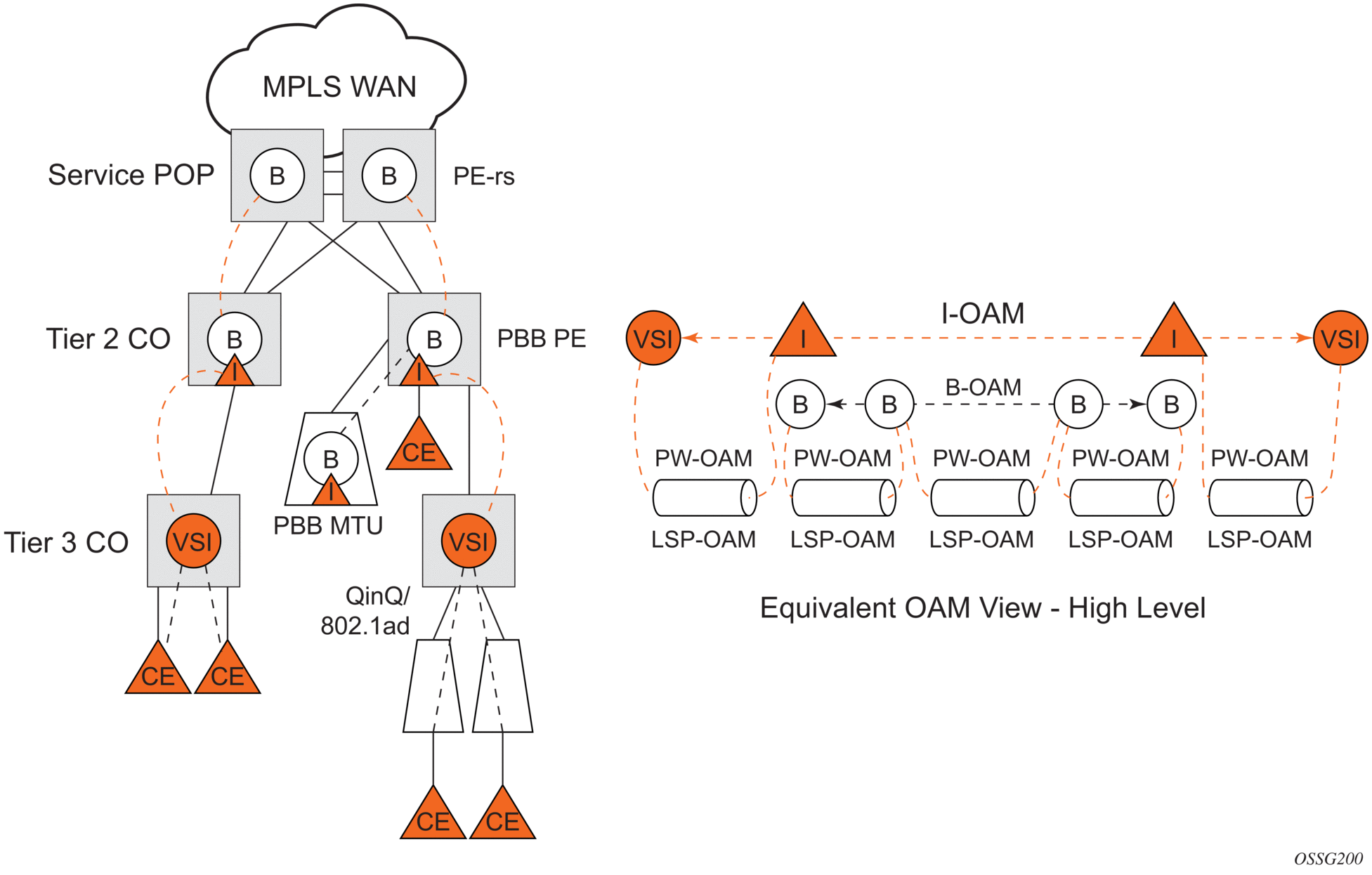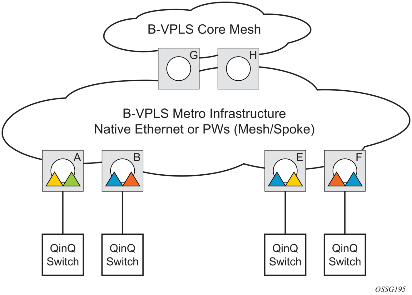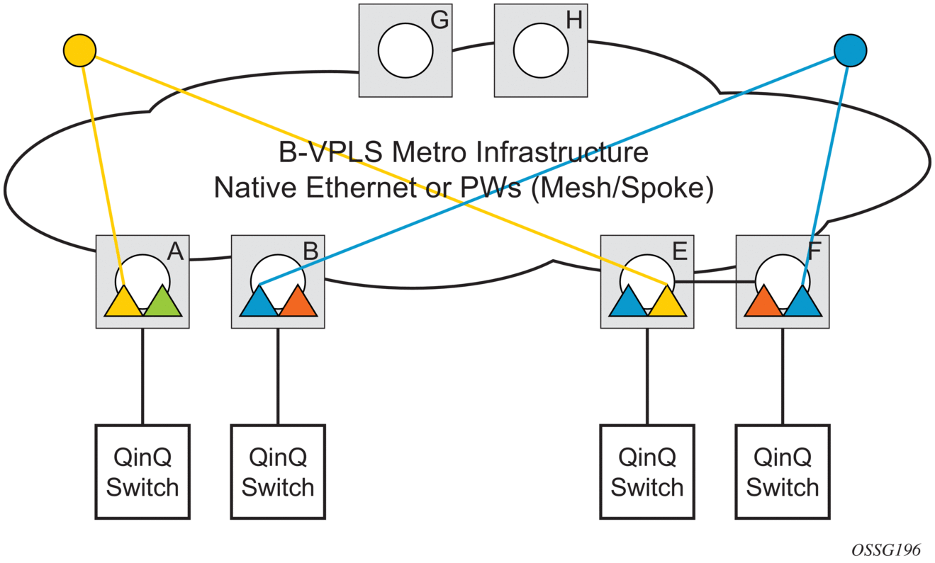 The customer CoS is contained in the orange dot1q VLAN tags managed in the customer domains. There may be one (CVID) or two (CVID, SVID) tags used to provide service classification at the SAP. IVPLS or PBB Epipe instances (orange triangles) are used to provide a Carrier-of-Carrier service.