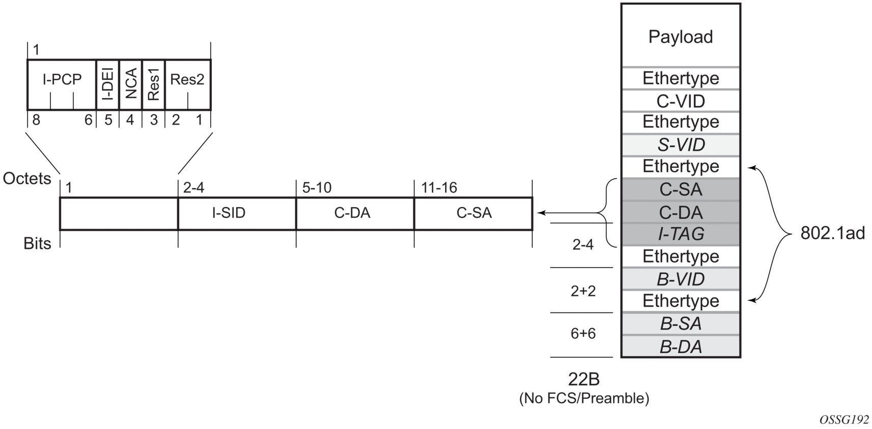 The following ITAG (standard Ether-type value of 0x88E7) has the role of identifying the customer VPN to which the frame is addressed through the 24 bit ISID. Support for service QoS is provided through the priority (3 bit I-PCP) and the DEI (1 bit) fields.