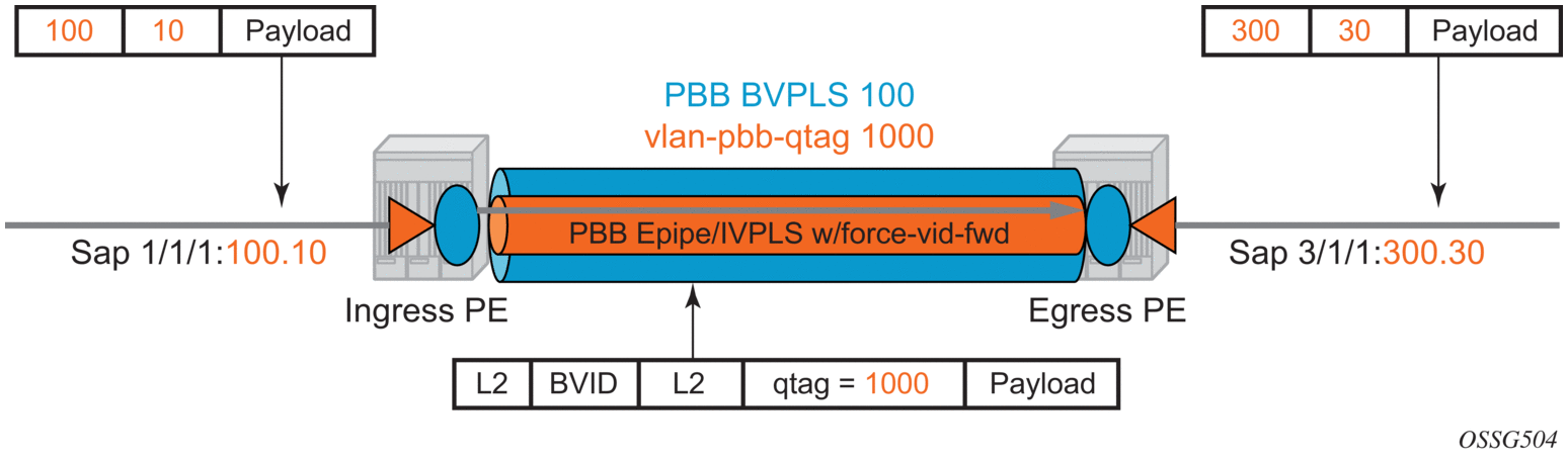 As the VLAN tags are stripped at the ingress SAP and added back at the egress SAP, the PBB implementation must provide a way to maintain the customer QoS marking. This is done using a force-qtag-forwarding configuration on a per IVPLS/Epipe basis under the node specifying the up link to the related BVPLS. When force-qtag-forwarding is enabled, a new VLAN tag is added right after the C-MAC addresses using the configured qtag. The dot1p, DE bits from the specified outer/inner customer qtag will be copied in the newly added tag.