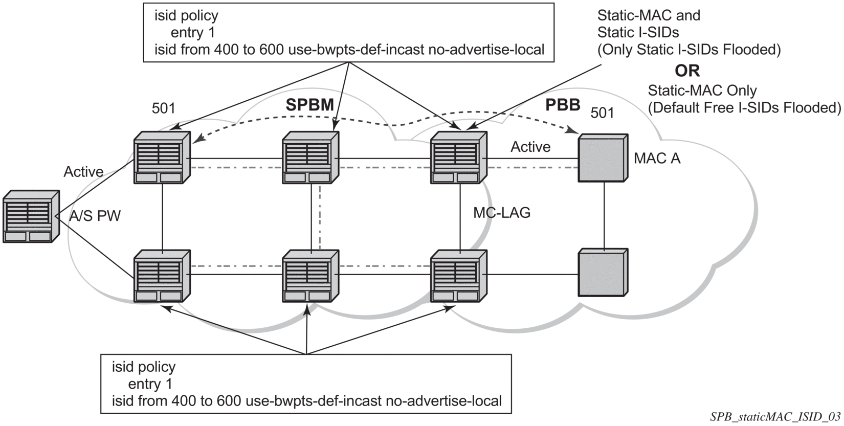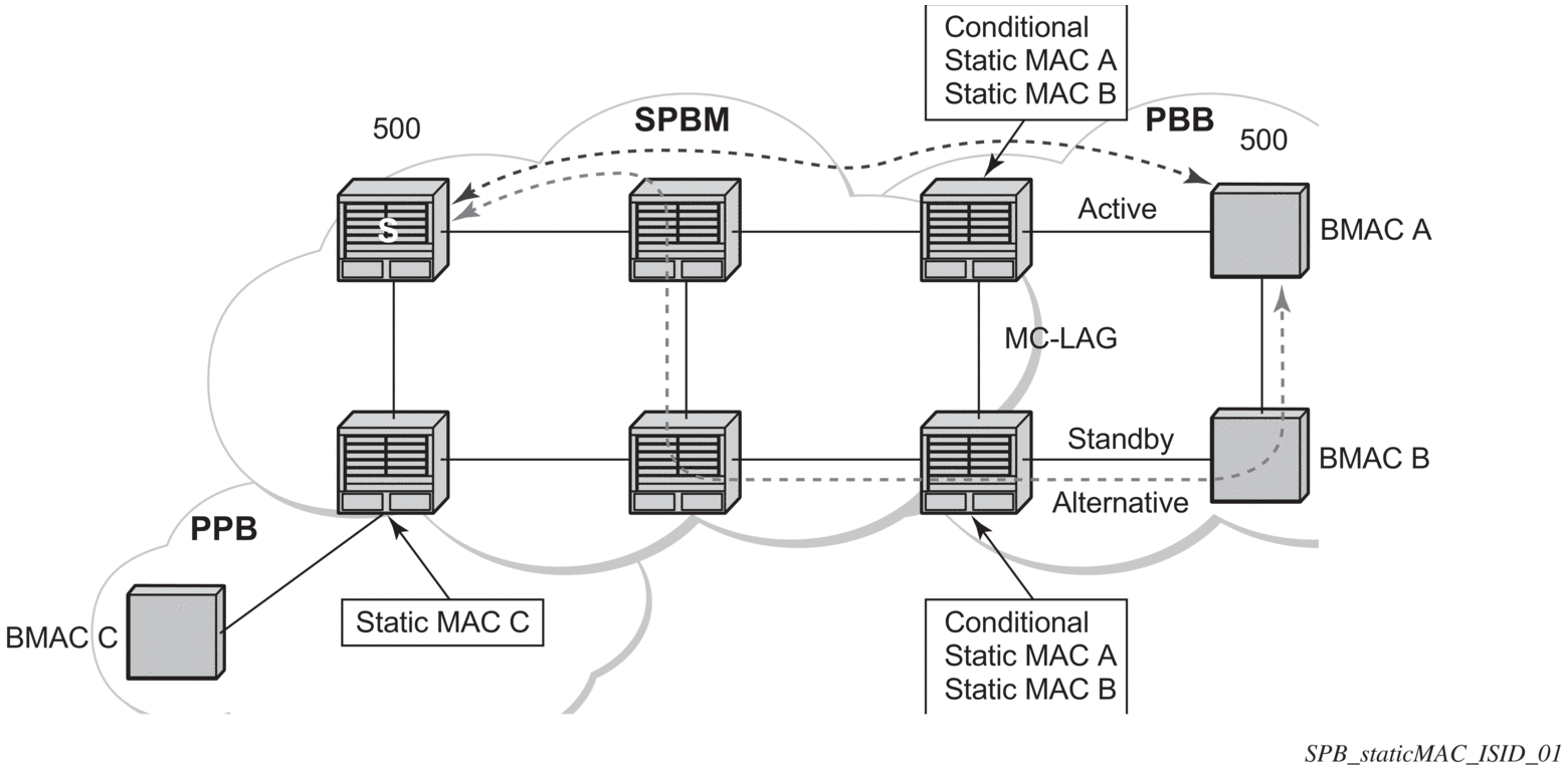 To extend SPBM networks to other PBB networks, static MACs and ISIDs can be defined under SPBM SAPs/SDPs. The declaration of a static MAC in an SPBM context allows a non-SPBM PBB system to receive frames from an SPBM system. These static MACs are conditional on the SAP/SDP operational state. (Currently this is only supported for SPBM since SPBM can advertise these B-MACs and ISIDs without any requirement for flushing.) The B-MAC (and B-MAC to ISID) must remain consistent when advertised in the IS-IS database.