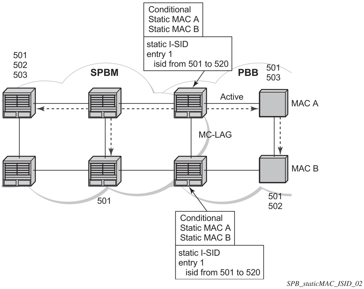 The Static B-MAC configuration is allowed under Multi-Chassis LAG (MC-LAG) based SAPs and active/standby PW SDPs.