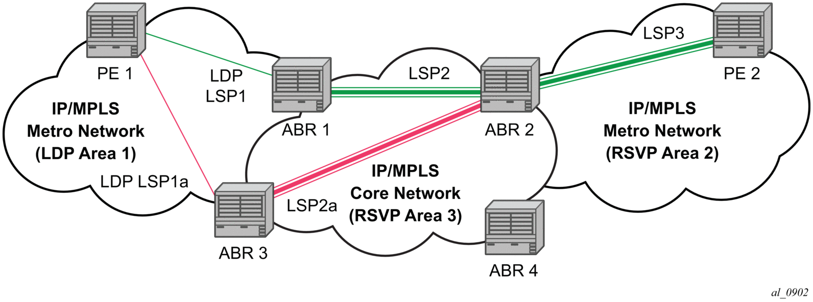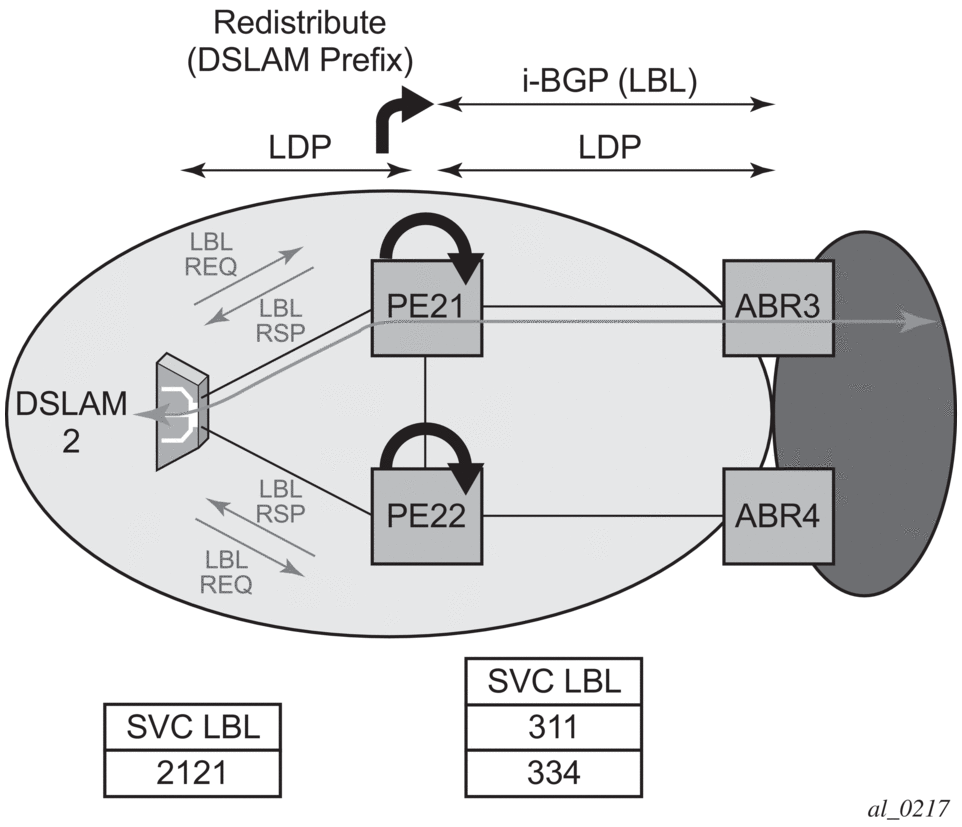 LDP signaling works with the MPLS label manager to manage the relationships between labels and the corresponding FEC. For service-based FECs, LDP works in tandem with the Service Manager to identify the virtual leased lines (VLLs) and Virtual Private LAN Services (VPLSs) to signal.