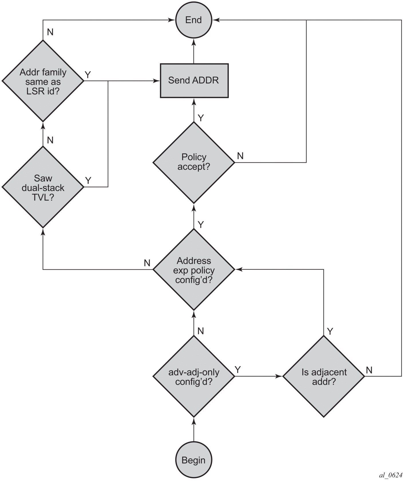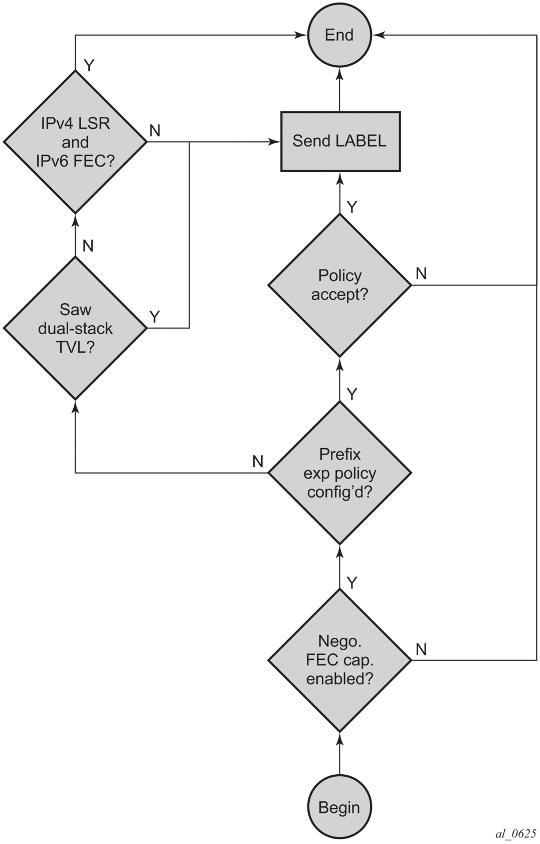 The above behavior applies to LDP IPv4 and IPv6 addresses and FECs. The procedure is summarized in the flowchart diagrams in Figure 112 and Figure 113.