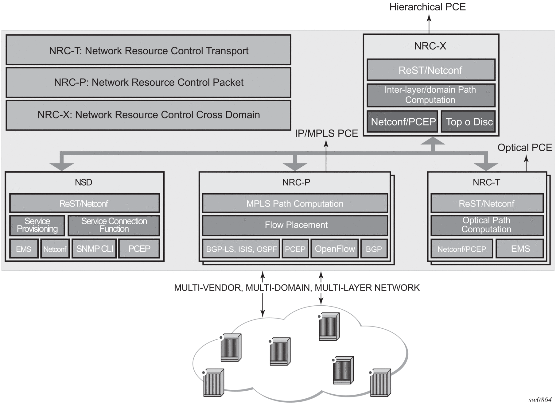 Network Resource Controller (NRC) — The NRC implements a separate module for computing and managing optimal paths for optical tunnels (NRC-T) and MPLS tunnels (NRC-P), and for computing optimal routing and placement of IP flows (NRC-P). In addition, a resource controller for inter-layer IP and optical path computation and more complex inter-domain MPLS path computation is provided as part of the NRC-X.