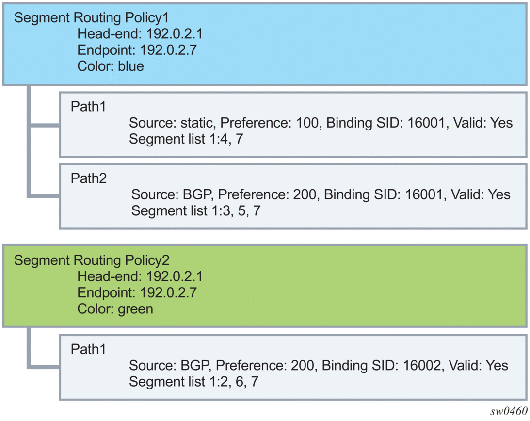 The concept of a Segment Routing (SR) policy is described by the IETF draft draft-filsfils-spring-segment-routing-policy. A segment-routing policy specifies a source-routed path from a head-end router to a network endpoint, and the traffic flows that are steered to that source-routed path. A segment-routing policy intended for use by a particular head-end router can be statically configured on that router or advertised to it in the form of a BGP route.
