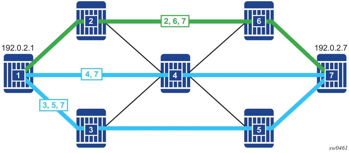 In each case, segment lists of the best preference path are initially programmed as forwarding NHLEs while the others are programmed as non-forwarding. If the maximum number of programmed paths for a specified mode has been reached (for example, two for ECMP protected mode, and three for linear mode), and a consistent new path is received with a better preference than the existing active path, then this new path is only considered if or when the route for one of the current programmed paths is withdrawn or deleted. However, if the maximum number of programmed paths for the mode has not been reached, then the new path is programmed and any configured revert timer is started. The system switches to that better preference path immediately or when the revert timer expires (as applicable).