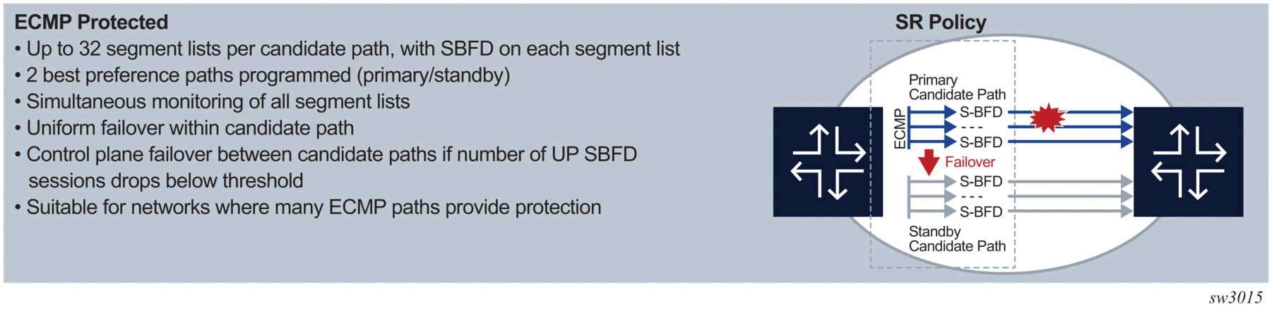 S-BFD provides a connectivity check for the data path of a segment list in an SR policy, and can determine whether the segment list is up. In addition, the router also supports two protection modes for an SR policy that are distinguished by the data path programming characteristics and whether uniform failover is required between segment lists in the same SR policy candidate path (ECMP protected mode), or between the programmed candidate paths (linear mode). These protection modes are driven by the S-BFD session state on the programmed segment lists of an SR policy.