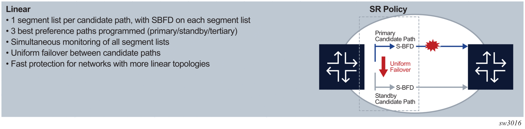 The linear mode supports uniform failover between candidate paths (policy routes) of the same SR policy. If linear mode is configured then the following rules apply.