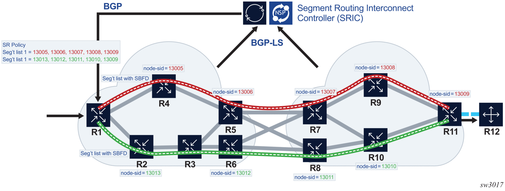 Figure 68 depicts an application for S-BFD on SR policies with ECMP protected mode. Here, an SR policy is programmed at R1 by the Nokia NSP with two segment lists from R1 to R11. One segment list is using R4/R5/R7R9, and the other segment list is using R2/R3/R6/R8 and R10. These segment lists are using diverse paths and traffic that is sprayed across both of them according to the configured hashing algorithm. Separate S-BFD sessions are run on each segment list and allow the rapid detection of data path failures along the whole segment list path. R1 is able to rapidly remove a segment list from the ECMP set if S-BFD goes down, and is also able to failover to a backup SR policy (not shown) (or fall back to a less preferred LSP) if more than a certain number of the S-BFD sessions go down.