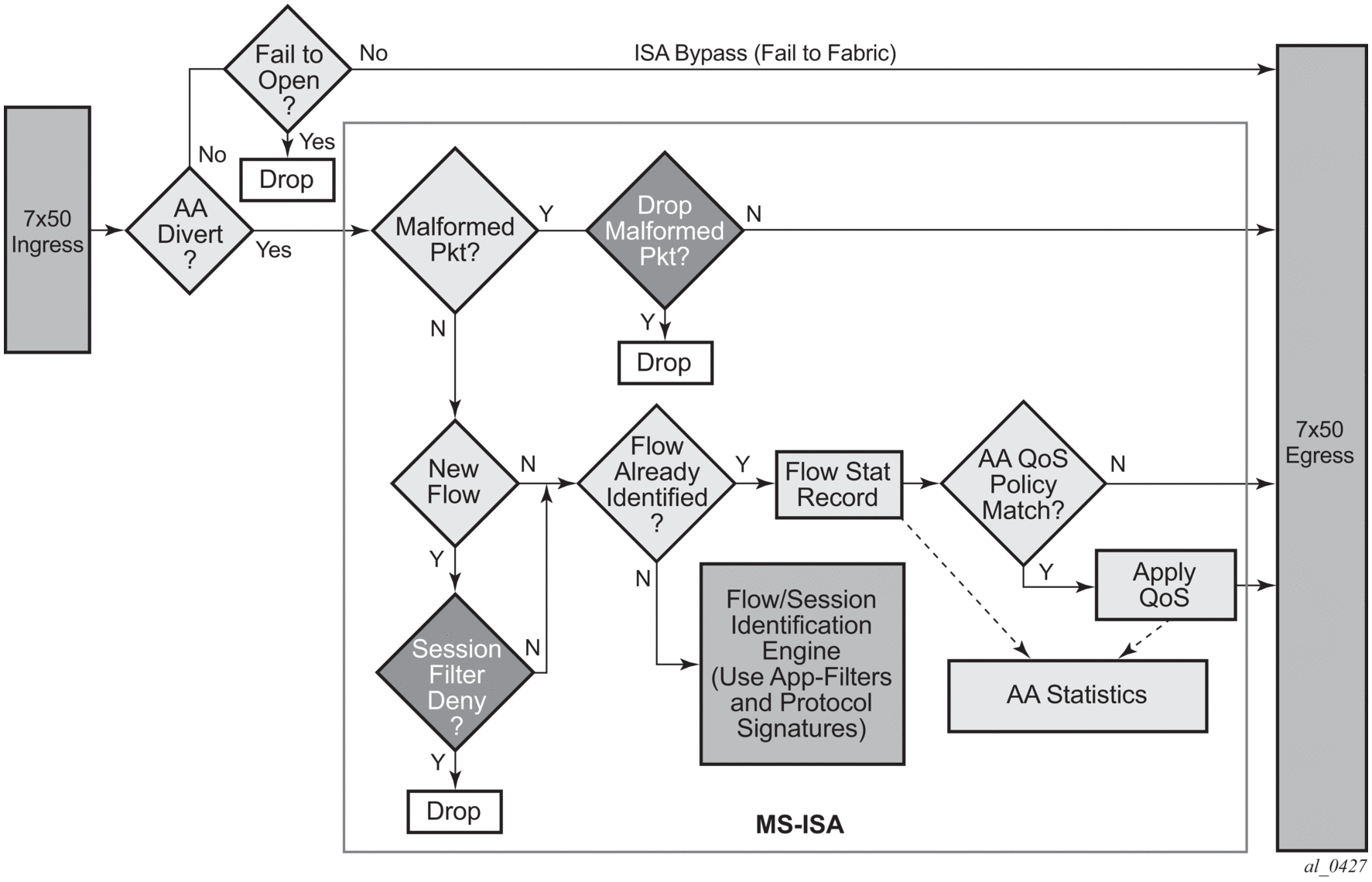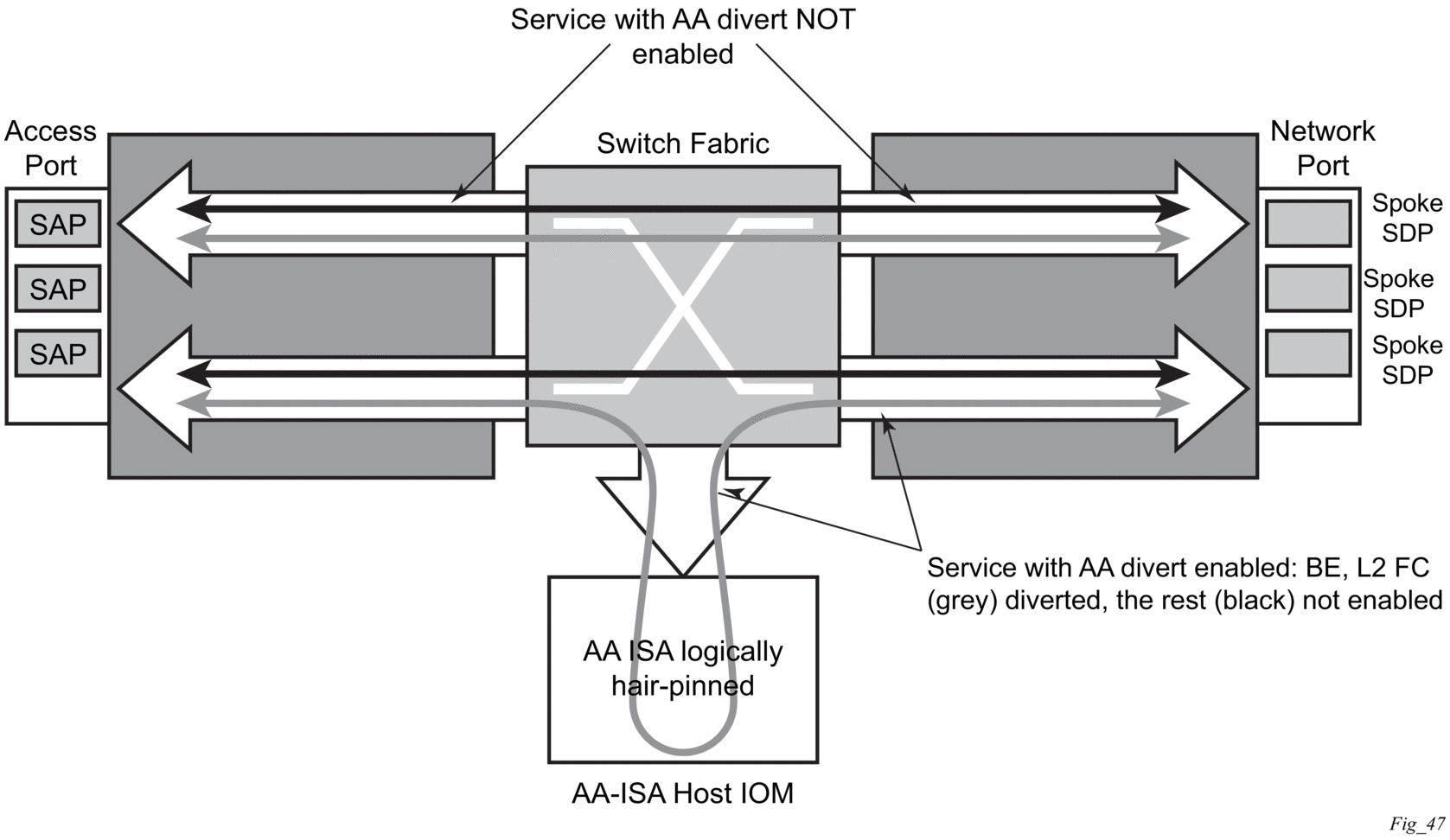 If no active AA ISA is available (for example, due to an operational failure, misconfiguration) the default behavior is to forward traffic as if no AA was configured, the system does not send traffic to the AA ISA (equivalent to fail to closed). Alarms are raised to flag this state externally. There is an optional “fail to open” feature where AA ISA service traffic is dropped if no active AA ISA is present (such as no AA ISA is present and operationally up).