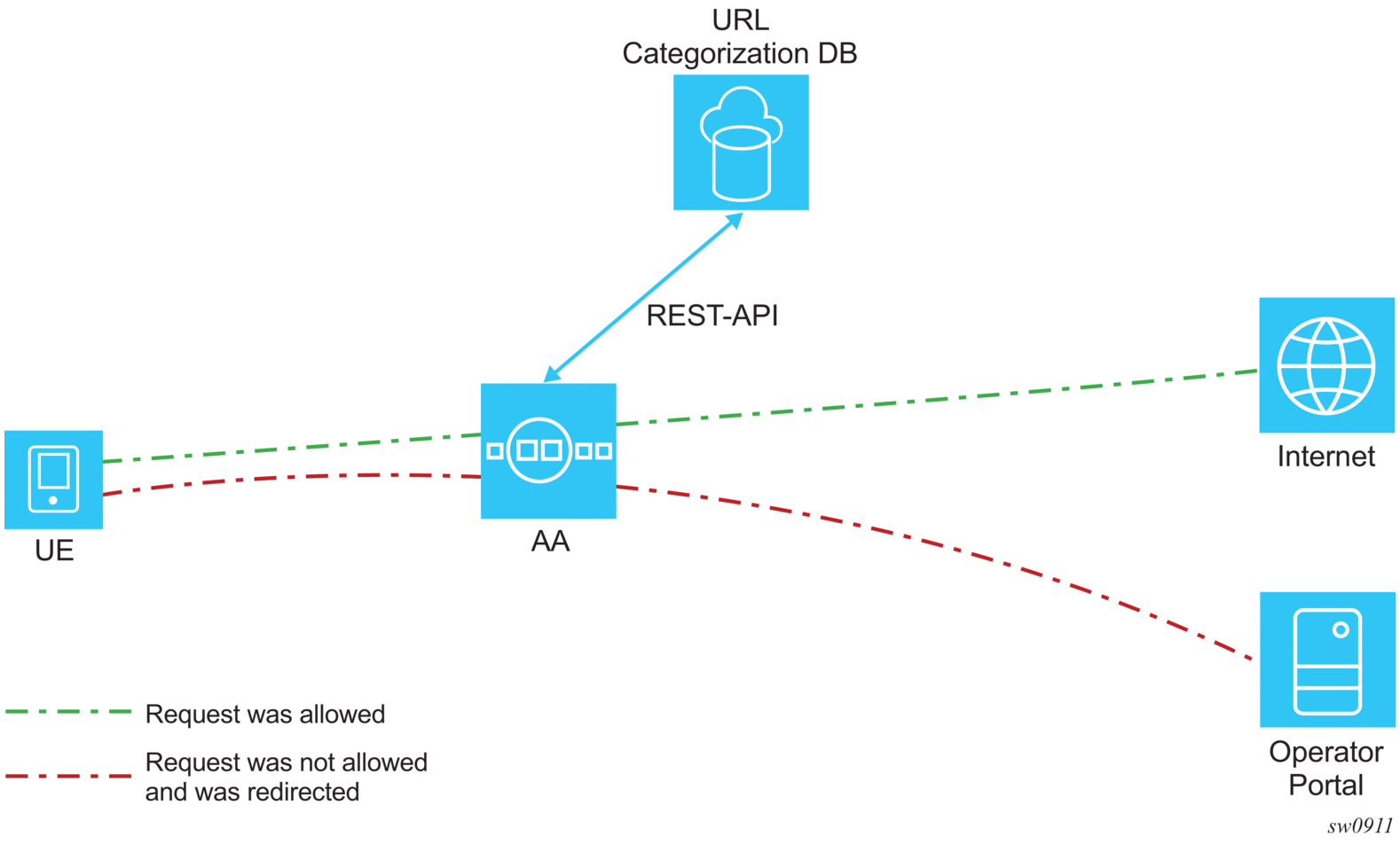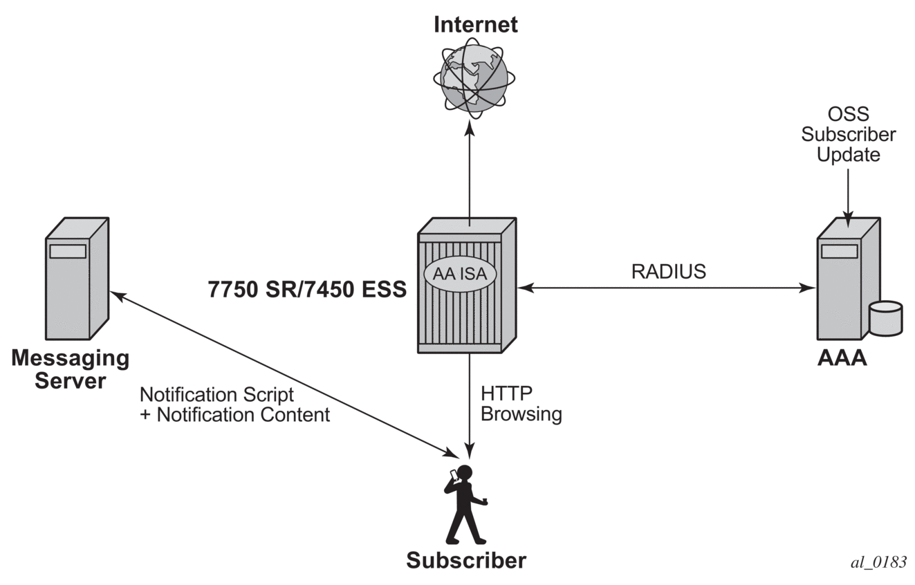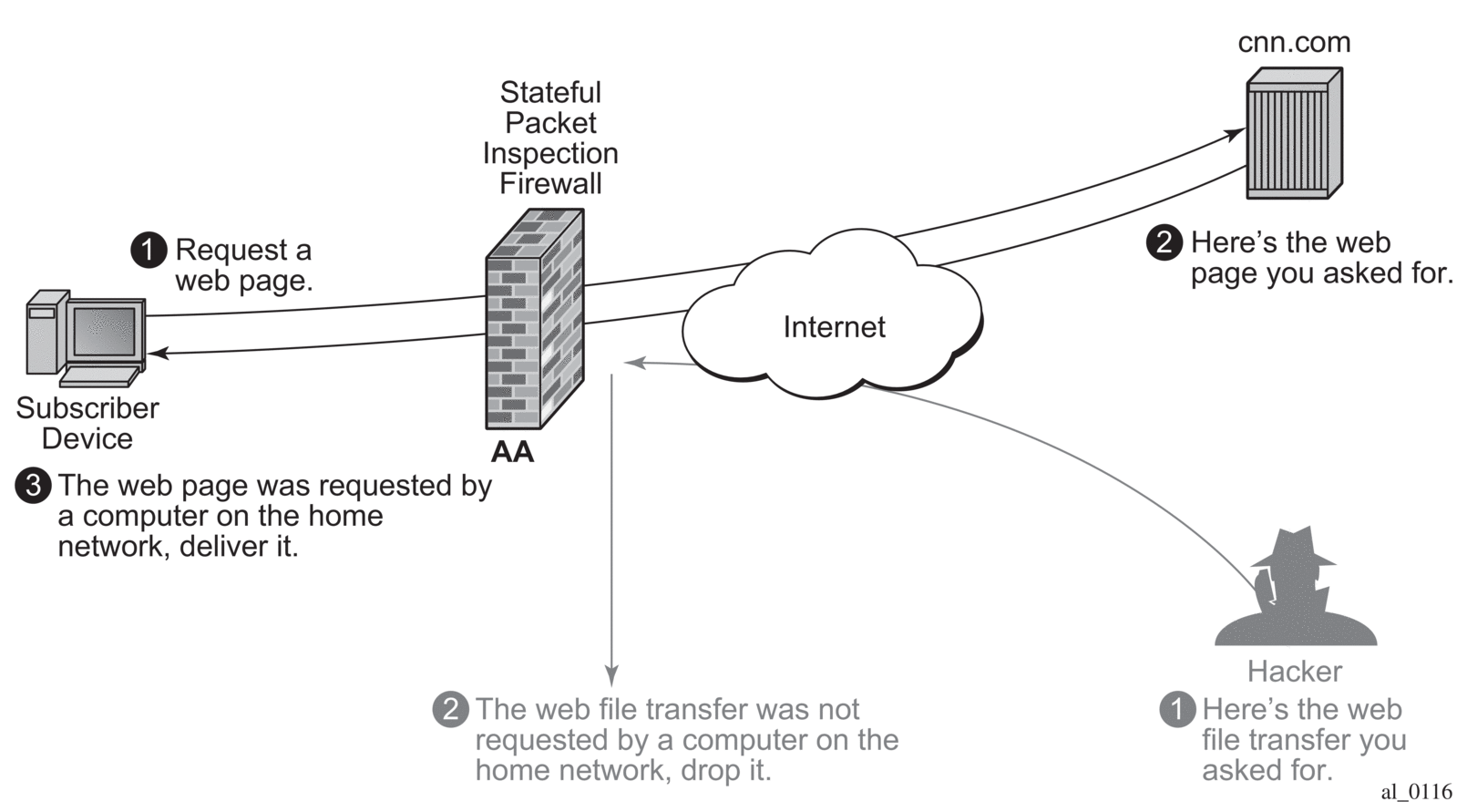 AA supports stateful firewall, which may be used for Gi firewall, GRX (GTP Roaming) firewall, or SeGW firewall deployed within a 7750 SR Security gateway in ultra-broadband access networks (3G/4G/Femto) and provides the operator with back-end core network security protection. For detailed information, see Application Assurance Firewall.