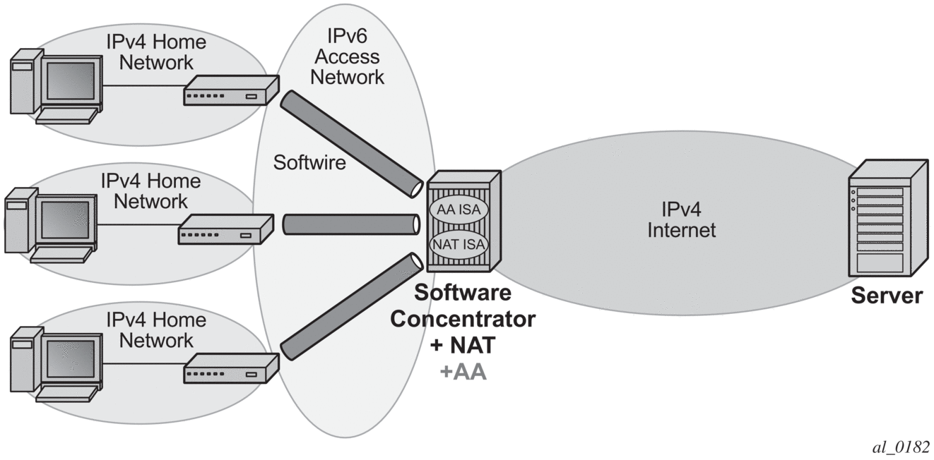 DS-Lite leverages a network address and port translation (NAPT) function in the service provider AFTR element to translate traffic tunneled from the private addresses in the home network into public addresses maintained by the service provider. On the 7750 SR, this is facilitated through the Carrier Grade NAT function.