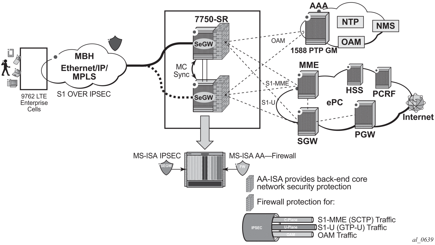 The 7750 SR SeGW with AA FW provides protection of SGW/SGSN infrastructure against an attack from a compromised eNB/FAP. AA FW supports: