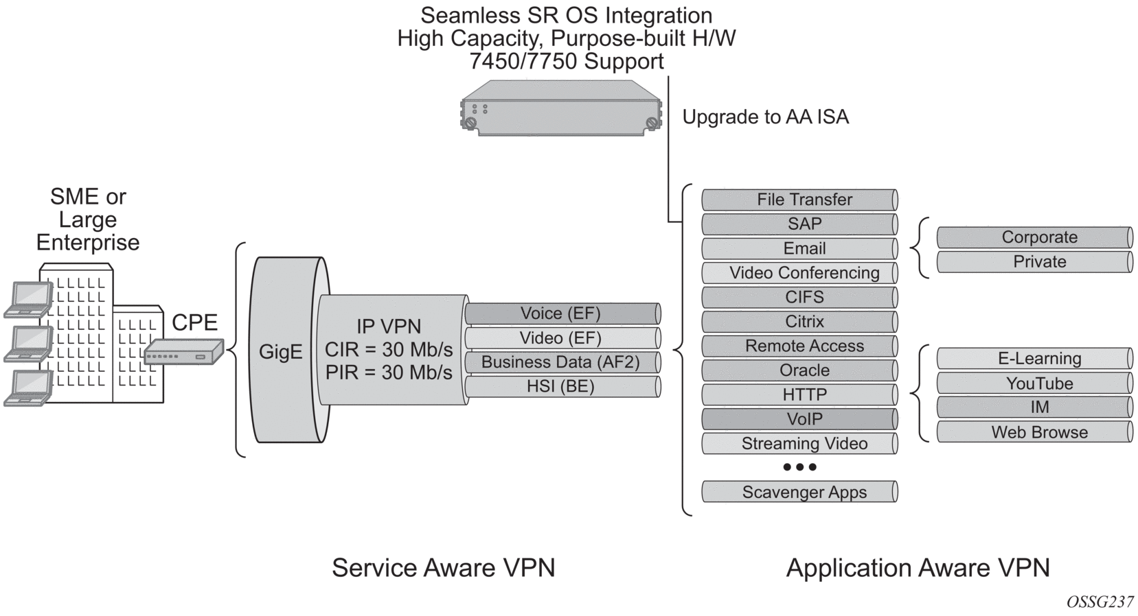 The integrated solution approach for AA recognizes that a per-AA subscriber and per-service capable QoS infrastructure is a pre-condition for delivering application-aware QoS capabilities. Enabling per-application QoS in the context of individual subscriber’s VPN access points maximizes the ability to monetize the application service, because a direct correlation can be made between customers paying for the service and the performance improvements obtained from it. By using an integrated solution there is no additional cost related to router port consumption, interconnect overhead or resilience to implement in-line application-aware policy enforcement.