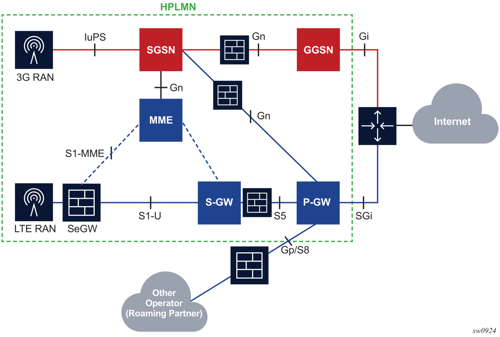 AA is deployed as a GTP firewall on S8/Gp (or S5/Gn) interfaces either as part of the 7750 SR router in the form of the AA-ISA hardware module or as a separate Virtual SR (VSR) appliance. The AA firewall provides network security features, such as:
